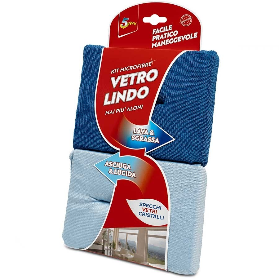 Kit per il lavaggio di vetri e cristalli Vetrolindo. Vetrolindo Blu ti consente di lavare comodamente vetri e specchi sgrassandoli profondamente anche solo con acqua Vetrolindo azzurra con una sola passata asciuga i tuoi vetri senza lasciare aloni.